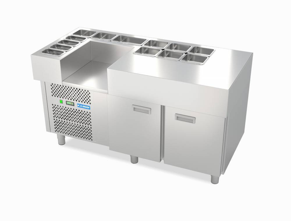Нерж.сталь,+2+8С, б/борта; 2 двери, направляющие под GN 1/1, агрегат слева; вырез в столешнице п/GN; в столешнице 1 ниша п/оборудование. Без гранитной столешницы.