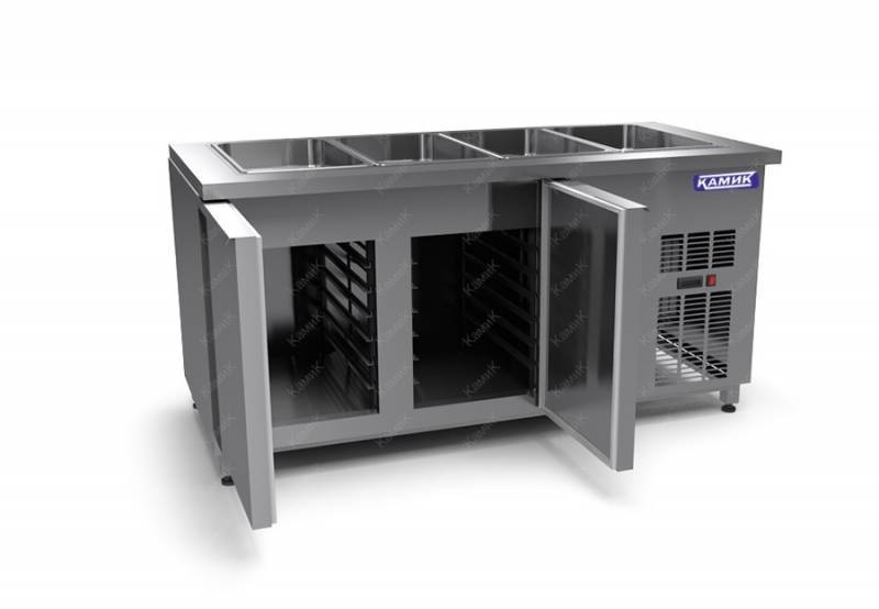 Нерж. сталь, 2 распашные двери, без охлаждаемого объема снизу, закрыт с трех сторон, полка-дно, температурный режим +2...+10, вместимость 4 шт GN 1/1 Глубина гастроемкости 150мм, напряжение 220В, мощность 0,8кВт . Каждая секция с дверью, оснащена полкой сетчатой и парой направляющих.