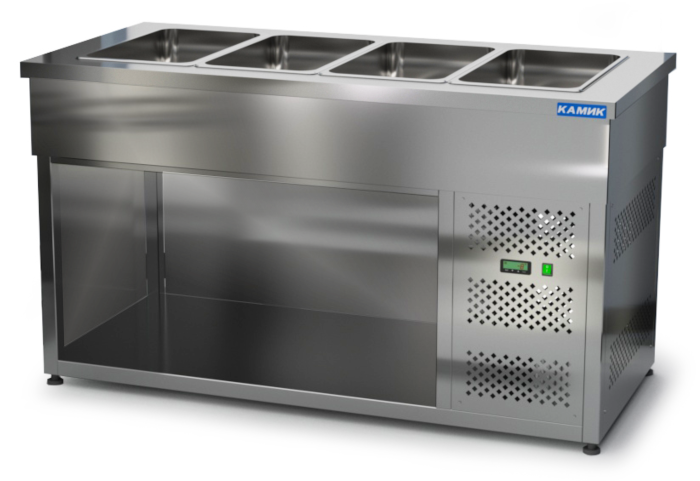 Нерж. сталь, без дверей, без охлаждаемого объема снизу, закрыт с трех сторон, полка-дно, температурный режим +2...+10, Вместимость 8*GN 1\6; 8*GN1\4, Глубина гастроемкости 150мм, напряжение 220В, мощность 0,8кВт.