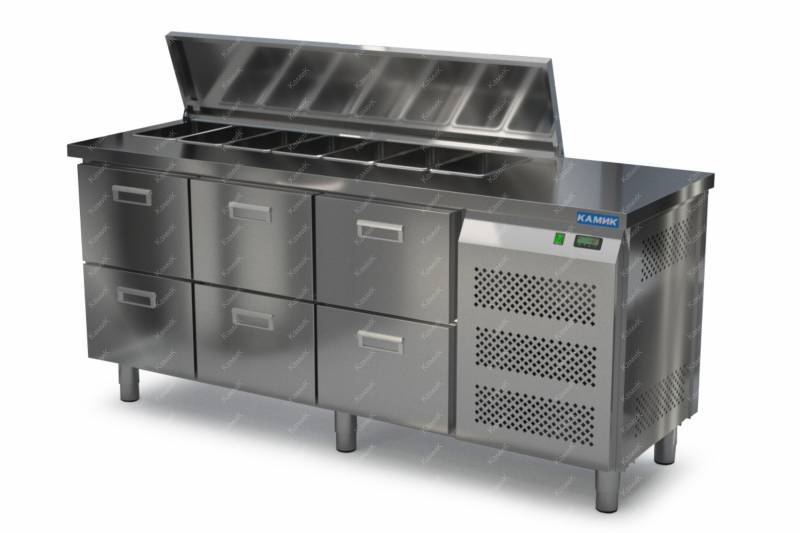 Нерж. сталь 6 ящиков, температурный режим +2...+10, без борта, Вместимость 7 шт GN 1/3 с крышкой, гастроемкости 150мм, объем 477 л, Напряжение 220В, мощность 0,9 кВт . Каждая секция с дверью, оснащена полкой сетчатой и парой направляющих.