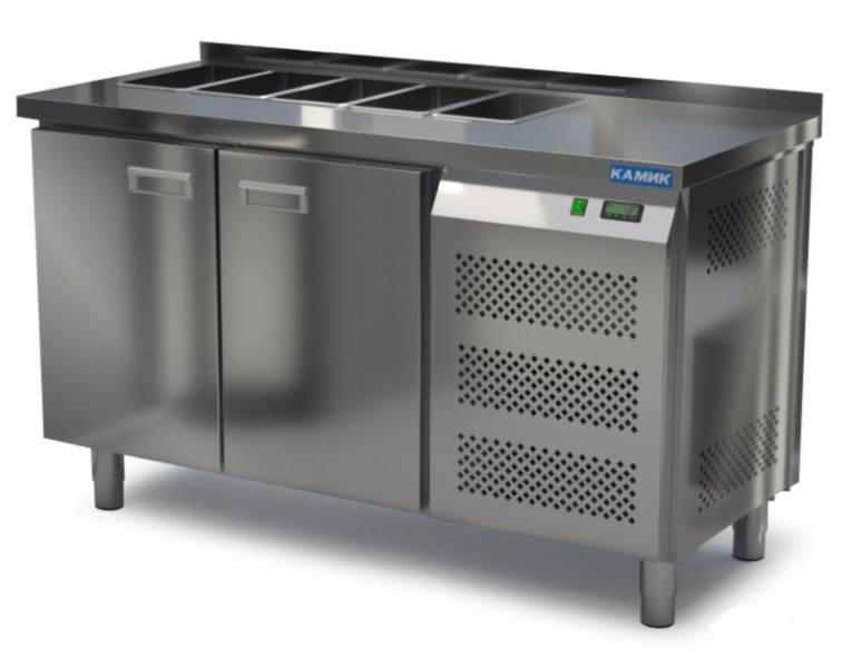 Нерж. сталь 2 двери, температурный режим +2...+10, с бортом, 5 шт GN 1/6 с крышкой, гастроемкости 150мм, объем 390 л, Напряжение 220В, мощность 0,9кВт . Каждая секция с дверью, оснащена полкой сетчатой и парой направляющих. , 900