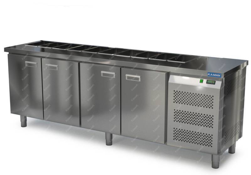 Нерж. сталь 4 двери, температурный режим +2...+10, с бортом, 10 шт GN 1/6 с крышкой, гастроемкости 150мм, объем 735 л, Напряжение 220В, мощность 0,9кВт . Каждая секция с дверью, оснащена полкой сетчатой и парой направляющих. , 900