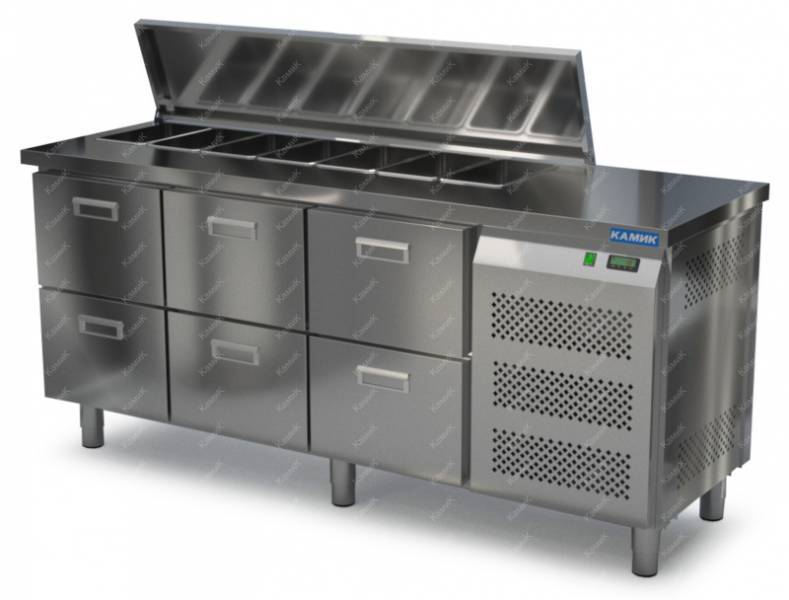 Нерж. сталь 6 ящиков, температурный режим +2...+10, с бортом, 7 шт GN 1/6 с крышкой, гастроемкости 150мм, объем 563 л, Напряжение 220В, мощность 0,9кВт . Каждая секция с дверью, оснащена полкой сетчатой и парой направляющих. , 900