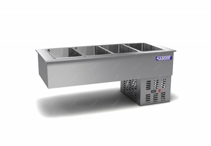 Нерж. сталь, 3 делителя. Регулировка температуры +2+8*С. Агрегат справа, размер отверстия для встраивания 1375*605. Вместимость 4 шт GN 1/1. Н-200мм, Напряжение 220В, мощность 0,8кВт. Чертеж 0577-Сбр встр. 1405х635х730_КМК_02.07.18