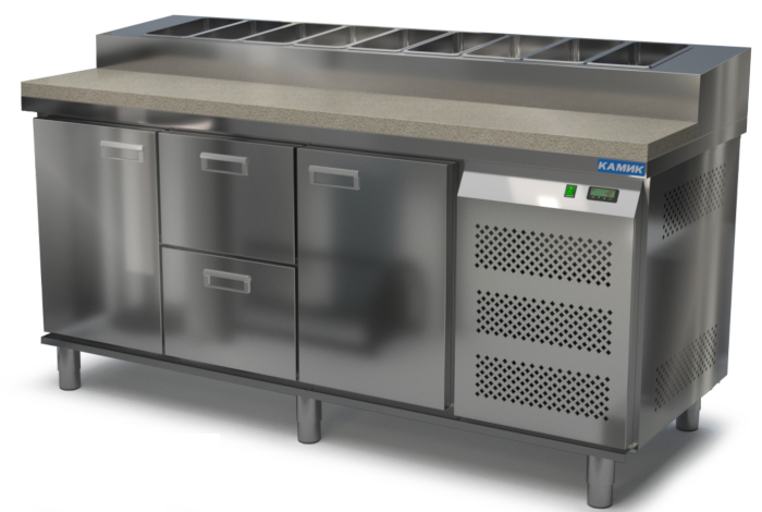 СТОЛ ОХЛАЖДАЕМЫЙ с горкой для пиццы GN 1/3 (боковой агрегат) 1850*700*850(990) 2 двери, 2 ящика