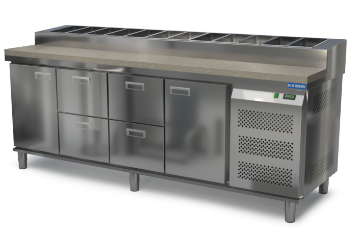 СТОЛ ОХЛАЖДАЕМЫЙ с горкой для пиццы GN 1/3 (боковой агрегат) 2300*700*850(990) 2 двери, 4 ящика, кам