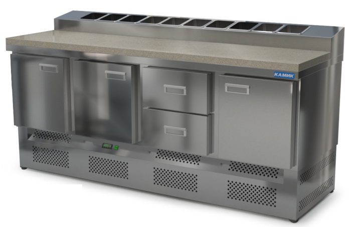 СТОЛ ОХЛАЖДАЕМЫЙ с горкой для пиццы GN 1/3 (нижний агрегат) 2000*700*850(990) 3 двери, 2 ящика, каме