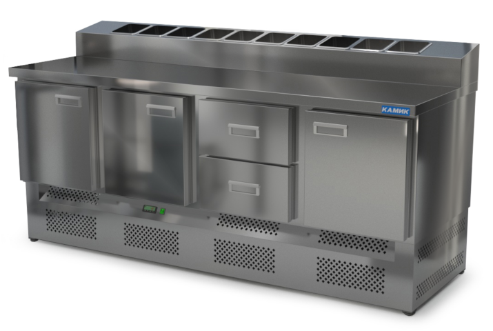 СТОЛ ОХЛАЖДАЕМЫЙ с горкой для пиццы GN 1/3 (нижний агрегат) 2000*700*850(990) 3 двери, 2 ящика