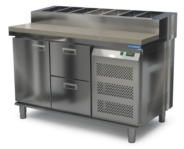 СТОЛ ОХЛАЖДАЕМЫЙ с горкой для пиццы GN 1/6 (боковой агрегат) 1400*700*850(990) 1 дверь, 2 ящика, кам