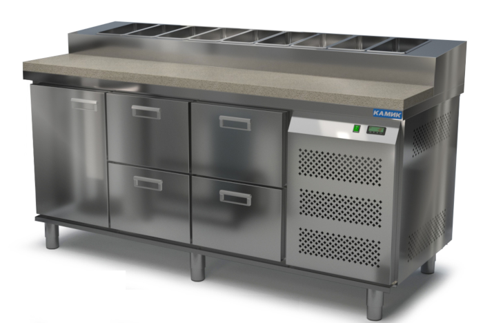 СТОЛ ОХЛАЖДАЕМЫЙ с горкой для пиццы GN 1/6 (боковой агрегат) 1850*700*850(990) 1 дверь, 4 ящика