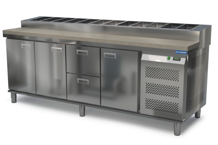 СТОЛ ОХЛАЖДАЕМЫЙ с горкой для пиццы GN 1/6 (боковой агрегат) 2300*700*850(990) 3 двери, 2 ящика, кам