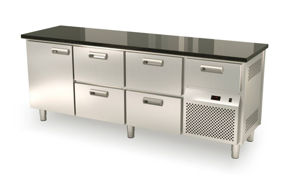 1 дверь, 4 ящика с дополнительным не гастронормированным-охлаждаемым ящиком над агрегатным отсеком. Фреон: Р404, столешница гранит