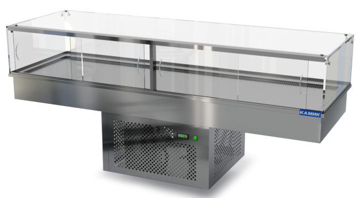 Универсальная встраиваемая холодильная витрина 1900*450*300(850) для общепита. Витрина оснащена каленым стеклом толщиной 10 мм и подстветкой.