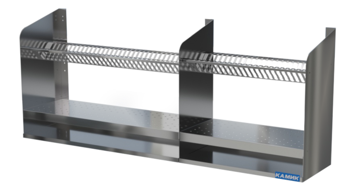Комбинированная настенная полка 1210*310*610 для предприятий общепита. Конструкция полностью из нержавеющей стали AISI 430. Верхняя полка-решетка предназначена для тарелок, нижняя для стаканов. Оснащена направляющими для воды. Лоток для воды в комплект не входит.