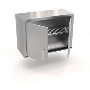 Настенная полка-шкаф 610*400*650 из пищевой нержавеющей стали AISI 304 для сушки тарелок. Предназначена для профессиональной кухни предприятий общепита. Задняя стенка из стали AISI 430. Оснащена 2 внутренними перфорированными полками и двумя распашными дверьми и лотком.