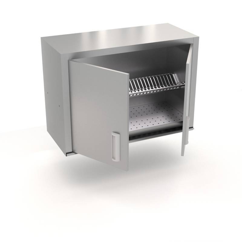 Настенная полка-шкаф 610*400*650 из пищевой нержавеющей стали AISI 430 для сушки тарелок. Предназначена для профессиональной кухни предприятий общепита. Задняя стенка из стали AISI 430. Оснащена 2 внутренними перфорированными полками и двумя распашными дверьми и лотком.