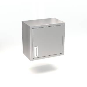 Настенная полка-шкаф 400*400*600 из пищевой нержавеющей стали AISI 304. Предназначена для профессиональной кухни предприятий общепита. Задняя стенка из стали AISI 430. Оснащена внутренней полкой и распашными дверьми.
