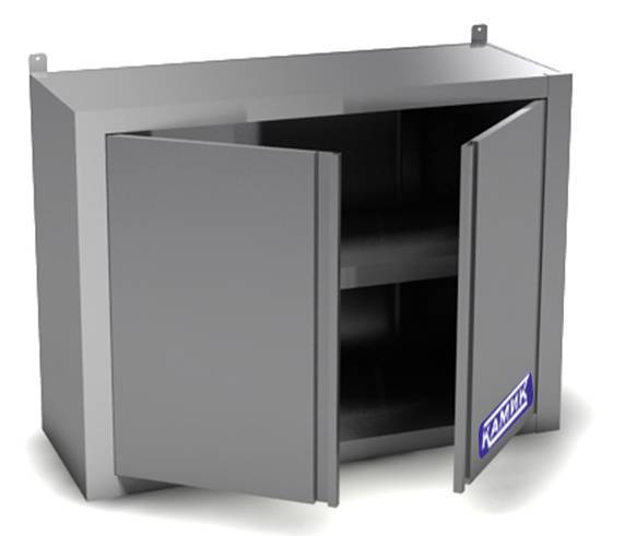 Настенная полка-шкаф 1000*400*600 из пищевой нержавеющей стали AISI 304. Предназначена для профессиональной кухни предприятий общепита. Задняя стенка из стали AISI 430. Оснащена внутренней полкой и распашными дверьми.