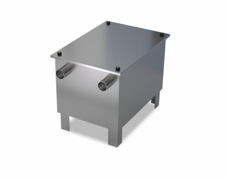 Нержавеющая сталь 430-1 мм. Жироулавливающая сетка. Вход и выход для канализации d=50 мм на высоте 360 мм. Крышка герметичная.