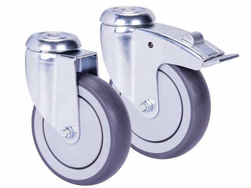Кронштейн: штампованный стальной, оцинкованный, двойной подшипник в поворотном узле. Колесо: шинка из немаркой термопластичной резины, ступица из полипропилена, шариковый подшипник в ступице, боковые защитные щечки из полипропилена. 3-а поворотных колеса со стопором+3-а поворотных колеса без стопора+крепеж. Общая нагрузка на изделие (6 колес) до 300 кг.