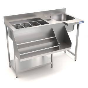 Нерж. сталь столешница AISI 304-1,5мм, AISI 304-1мм, м, остальное - нерж. сталь AISI 430-1мм, проф. трубы 20*40, борт 100мм. Ванна цельнотянутая 400*400*250 справа, Ванна д/льда с перегородками (орг. стекло) и перф. вставками. Рейл двойной, полка для блендера.