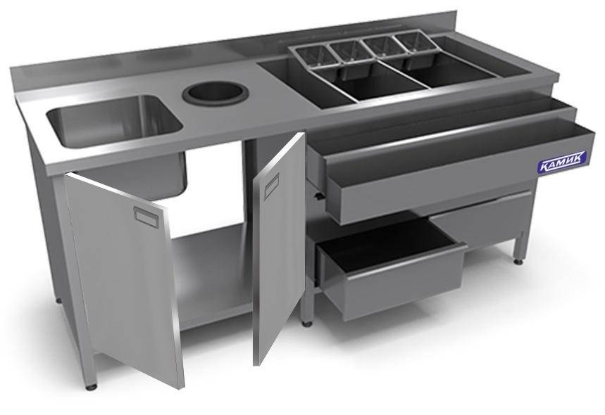 Нерж.сталь 304-1,5 мм, 430-1 мм, проф.40*40, борт 100мм, мойка 400*400*250 слева, отверствие д/отходов d=165мм, ванна теплоизолированная для льда 950*500*265 сварная с перфор. вставками на дне, вставка съемная под 4GN 1/6, 1 съемный рейл +1 не съемный рейл для бутылок, 4 выдвижных ящика.