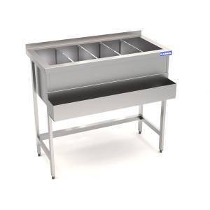 Столешница, ванна, перегородки - нерж. сталь AISI 304-1,5мм, AISI 304-1мм, м, остальное - нерж. сталь AISI 430-1мм, проф. трубы 20*40, 40*40. борт, ванна сварная теплоизолированная 1000*380*350 (под лед), 3 вставки перф. съемные, 4 перегородки съемные, фартуки спереди и по бокам, открытая, обвязка по бокам и сзади (150 мм от пола), рейл передний под бутылки съемный.