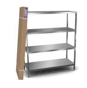 Удобный разборный стеллаж 1000*400*1800 из профиля нержавеющей стали AISI 304 для кафе, торговых сетей и складских помещений. В стеллаж установлены четыре сплошные полки AISI 430. Регулируемое расстояние между ними 130 мм.