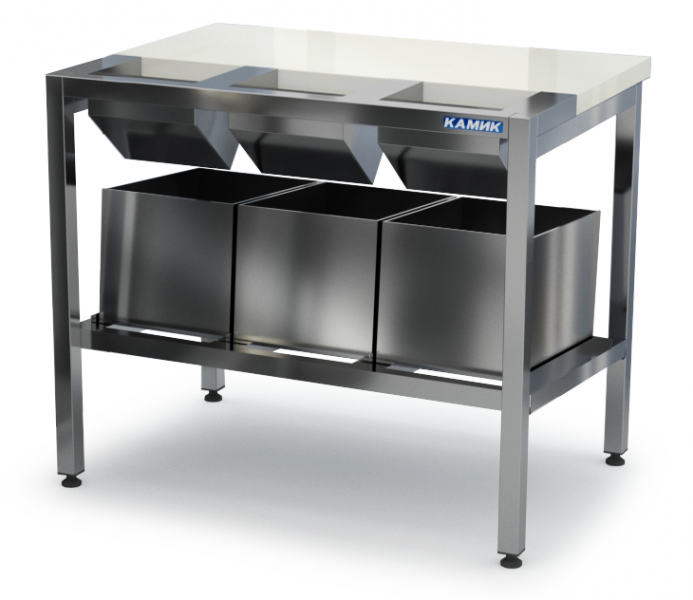 Нерж. сталь 304-1,5 мм/430-1мм, Б/борта, 3 бункера, Направляющие для ящиков (ящики 300*400*270 в комплект не входят), Полипропиленовая столешница 1100*450*35 мм.