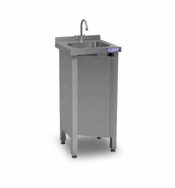 Одна емкость цельнот. из ст AISI 304 295*235*150 Столешница из стали AISI 430, Каркас из стали AISI 430, закрыт по бокам, сзади открыт, 1 дверь распашная (ручка справа), смеситель Россия, борт. полка (узкая)