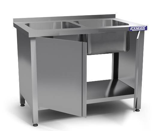 2 емкости цельнот. из ст AISI 304 400*400*250, Столешница из стали AISI 430, Каркас сварной из стали AISI 430, распашные двери, полка-дно, крыло, мойки слева , борт. закрыта по бокам (без задней стенки)