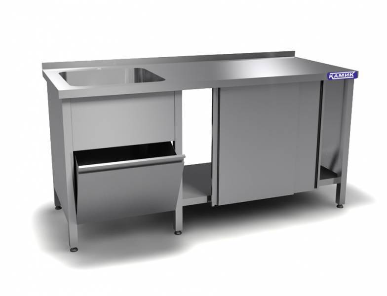 Ванна моечная цельнотянутая. Одна емкость цельнот. из ст AISI 304 600*500*300 Столешница из стали AISI 430 Каркас сварной из стали AISI 430 двери купе, крыло, полка , борт, 6 опор. закрыта по бокам (без задней стенки)