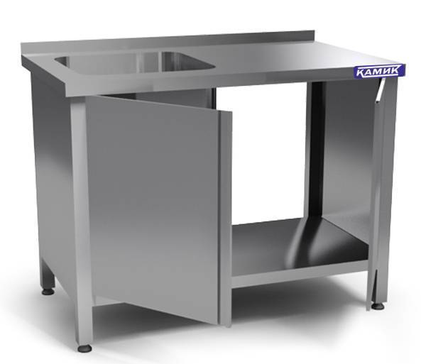 Одна емкость цельнот. из ст AISI 304 500*500*300 Слева. Столешница из стали AISI 430 Каркас сварной из стали AISI 430 расп. дверки, полка-дно, борт. закрыта по бокам (без задней стенки)