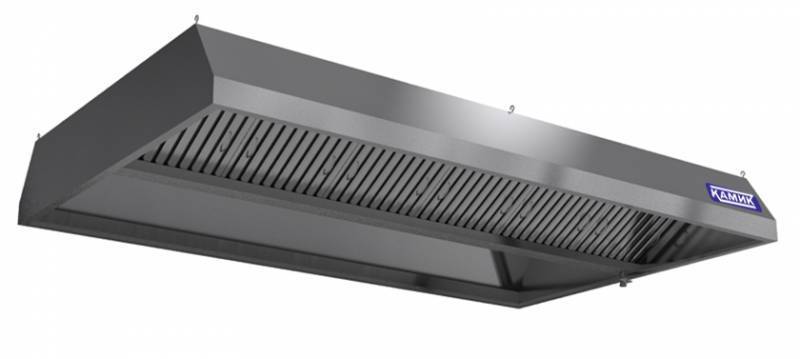 Зонт вытяжной центральный 1800*2600*350 на сварной конструкции из пищевой нержавеющей стали AISI 430, установлены лабиринтные фильтры для очистки воздуха, возможна дополнительная комплектация, гарантия год
