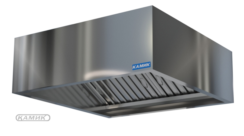 Зонт вытяжной пристенный коробчатый ВП-К-117 из пищевой нержавеющей стали AISI 430 с жироуловителями (лабиринтными фильтрами) для очистки воздуха на профессиональной кухне, возможна дополнительная комплектация