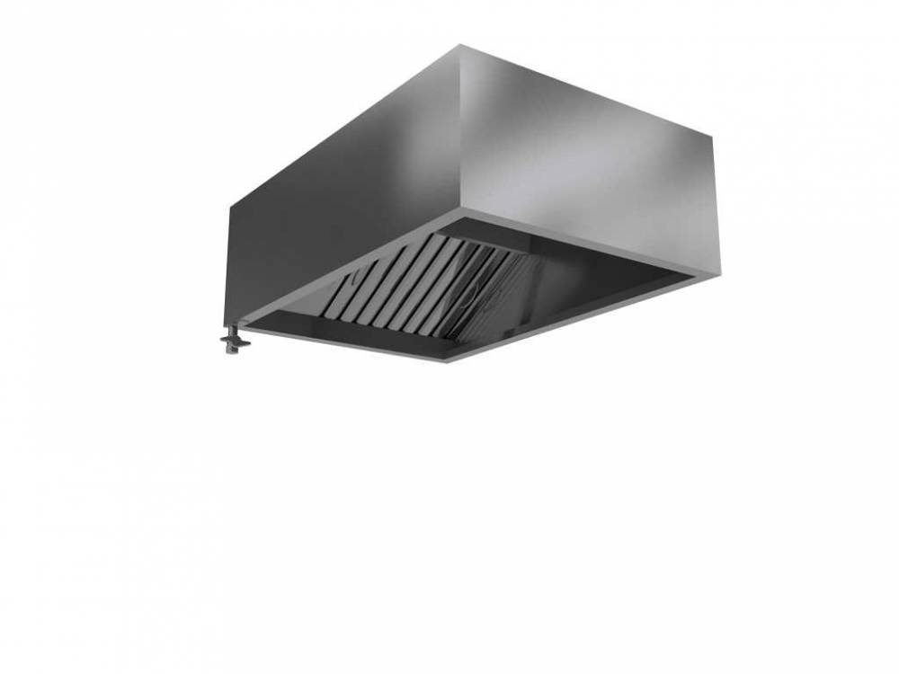 Зонт вытяжной пристенный коробчатый ВП-К-129 из пищевой нержавеющей стали AISI 430 с жироуловителями (лабиринтными фильтрами) для очистки воздуха на профессиональной кухне, возможна дополнительная комплектация