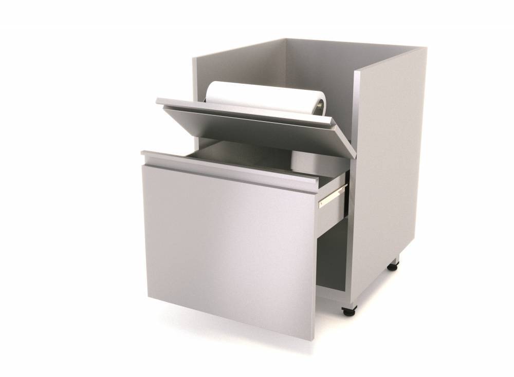 Тумба для мусора, с держателем для бумажных полотенец. Корпус - нерж.сталь 430-1мм. 1 ящик с роликовыми направляющими, жесткая легко обслуживаемая мусорная корзина. Верхний отсек тумбы оснащен откидной дверцей и держателем для бумажных полотенец. Тумба не предназначена для инсталляции раковины или газовой конфорки. Без столешницы. Расчет стоимости столешницы и материал производится индивидуально.