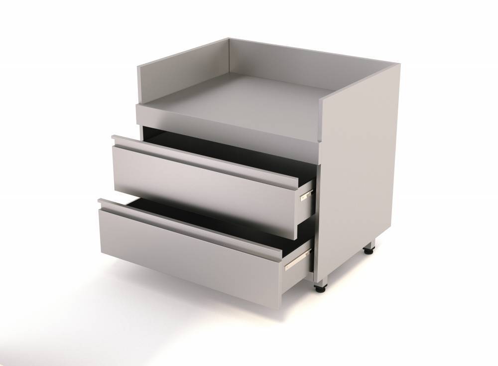 Тумба-основание для встраиваемого гриля. Столешница - нерж. сталь 430-1мм. Корпус - нерж.сталь 430-1мм. 2 ящика с роликовыми направляющими. Задняя и боковые панели имеют вариативные отверстия для газовых труб. Гриль не включен в стоимость. Расчет стоимости столешницы и материал производится индивидуально.