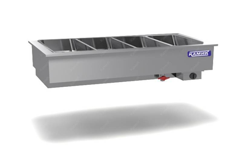 Кол-во GN 1/1-4, Корпус сталь AISI 430 Ванна с теплоизоляцией под 4GN1/1 Н-200, 3 делителя. Регулировка температуры от +30+85°С. Термостат справа. Мощность, кВт 3,6