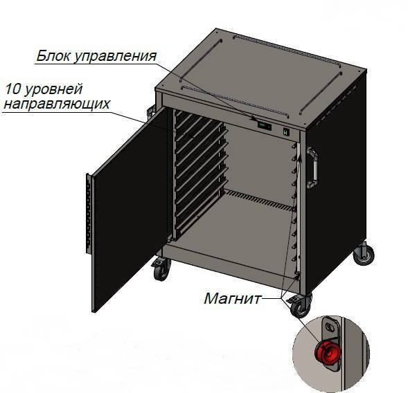 Кол-во уровней 10. сталь AISI 430, 1 дверь распашная (петли слева) Направляющие под GN2/1, Регулировка температуры +30+80°С. На колесах. Мощность, кВт 1,4.